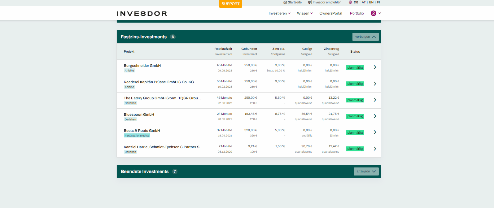 U kunt rente- en aflossingsbetalingen bijhouden met een betalingsoverzicht, dat voor elke investering apart wordt aangemaakt. Met behulp van deze gedetailleerde betalingsoverzichten kunt u op elk moment bijhouden welke bedragen al zijn afgelost en welke betalingen nog moeten worden gedaan. Daarnaast is het mogelijk om een dagelijks bijgewerkte export van alle betalingen te downloaden in de vorm van een Excel-bestand. De rentebetalingen worden direct overgemaakt naar de bankrekening die u in uw profiel hebt opgegeven.