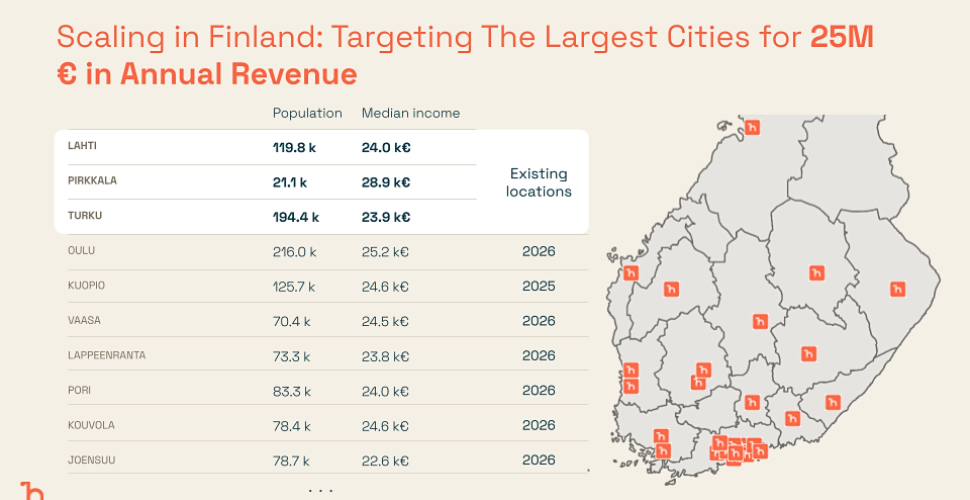 Onze huidige aanname is dat een gebied minstens ongeveer 50.000 inwoners moet hebben om het vereiste volume te bereiken. Finland telt ongeveer 20 steden met een bevolking van minimaal 50.000 inwoners. Wanneer we ons huidige model opschalen naar de Finse markt, zien we voor Huuva een potentieel van ongeveer €66 miljoen. Ter vergelijking: de jaarlijkse omzet van McDonald’s in Finland bedraagt ongeveer €330 miljoen en die van Hesburger circa €260 miljoen.