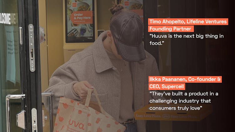 Testimonials van Timo Ahopelto (Lifeline Ventures) en Ilkka Paananen (Supercell) benadrukken het sterke team van Huuva, de focus op uitvoering en het schaalbare businessmodel.