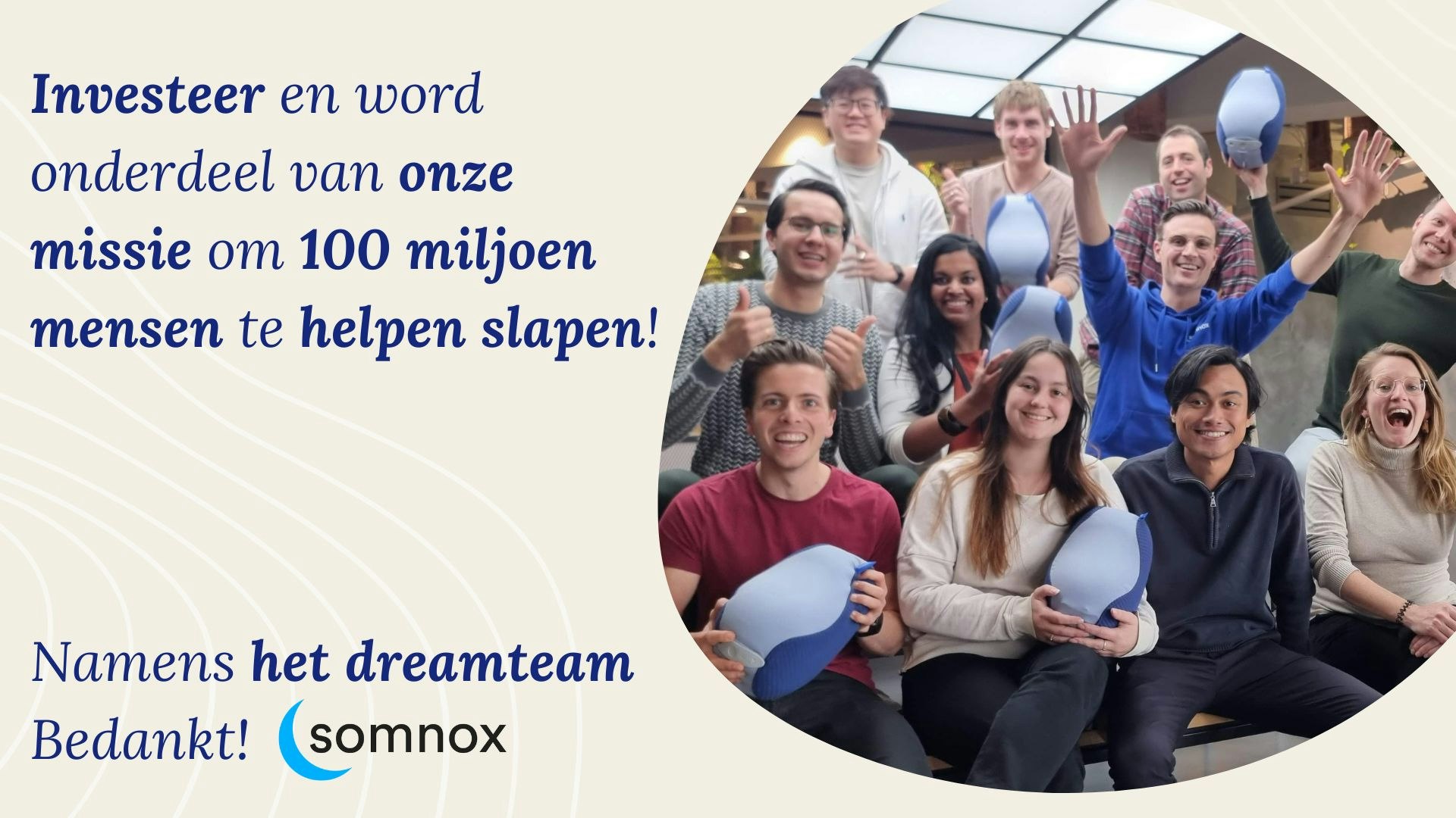 Somnox wordt gerund door een divers en getalenteerd team van ingenieurs van de TU Delft, commerciële talenten van o.a. Philips en Unilever en werkt nauw samen met o.a. Auping, CZ, Zilveren Kruis en een aantal vooraanstaande slaapwetenschappers.
