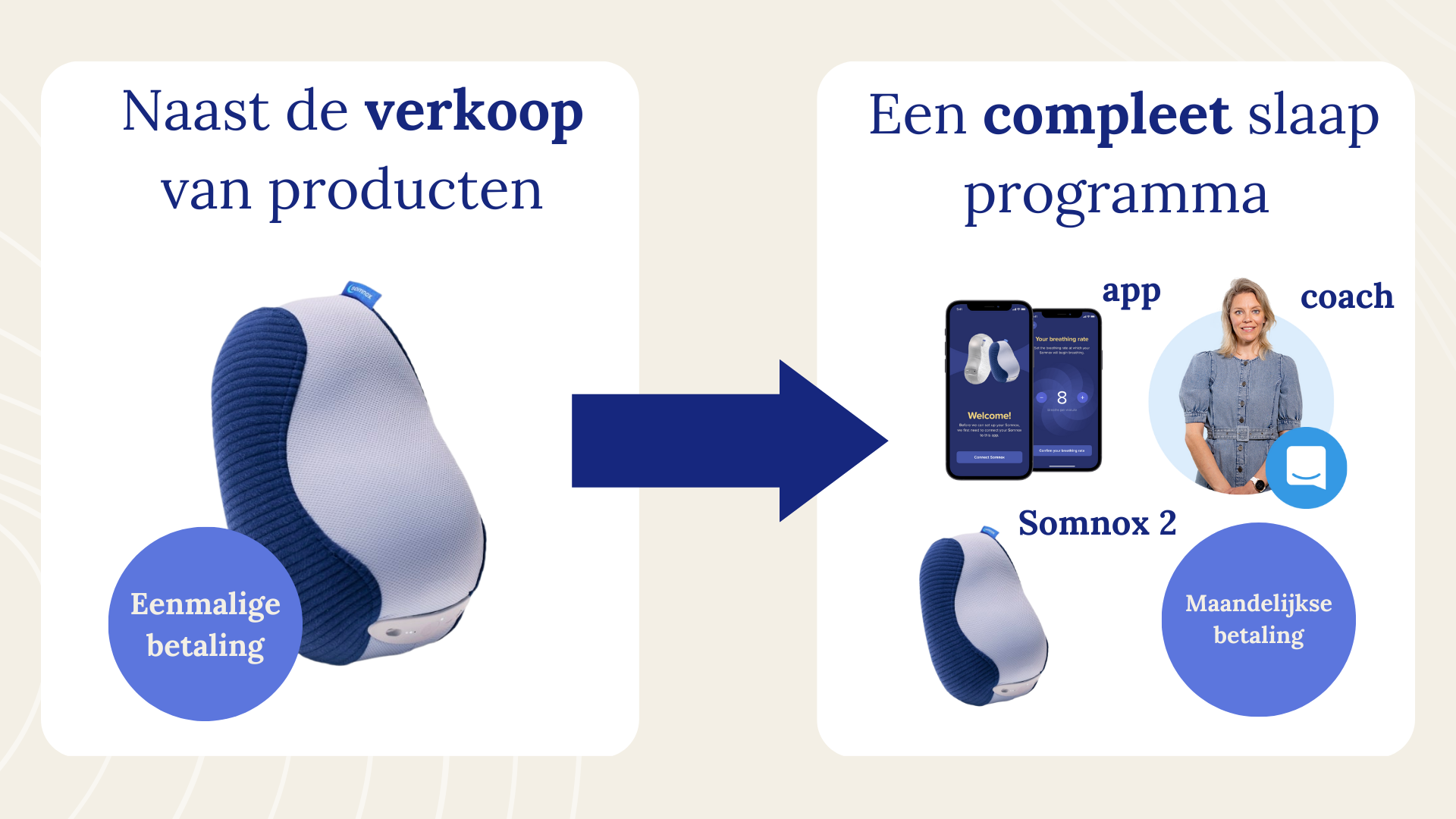 Om onze missie te kunnen realiseren, willen wij onze technologie toegankelijk maken voor een grotere doelgroep. Door in te zetten op een slaapprogramma (Slaap als een Service). Hierdoor krijgen slechte slapers voor een maandelijks bedrag een complete slaapoplossing. Daarmee kan een grotere groep op een laagdrempelige manier kennis maken met de Somnox en kunnen samenwerkingen met strategische partijen, zoals verzekeraars, worden uitgebouwd.