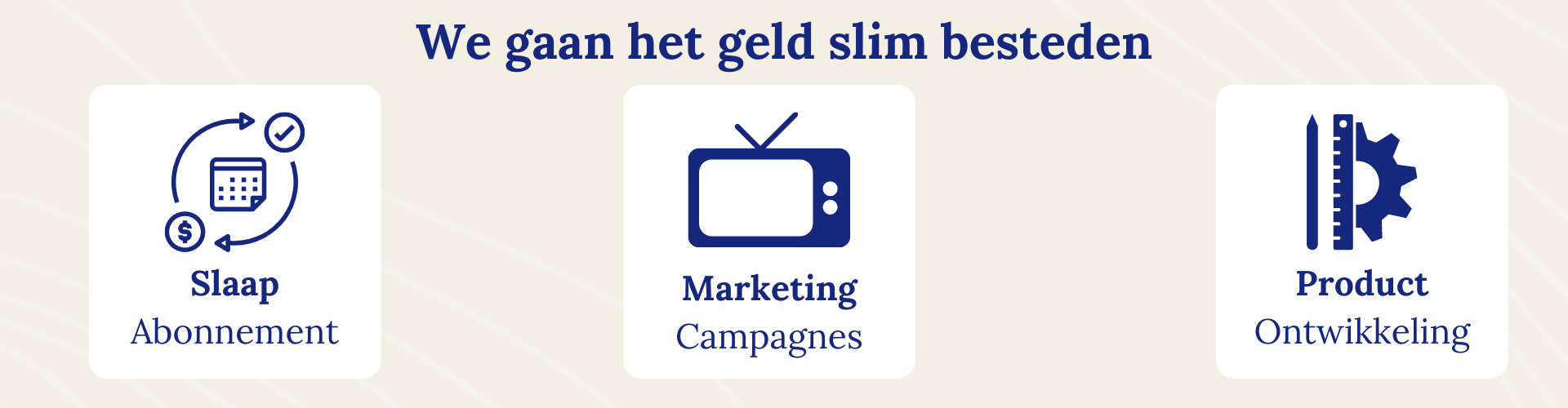 De € 1M in additionele financiering die wij zoeken, wordt gebruikt om dit te realiseren. De financiering zal vooral besteed worden aan voorraadfinanciering voor het slaapprogramma, marketingcampagnes om Somnox bij een breder publiek bekend te maken en productontwikkeling om de gebruiker steeds gerichter te ondersteunen bij de ademhaling en het in slaap vallen.